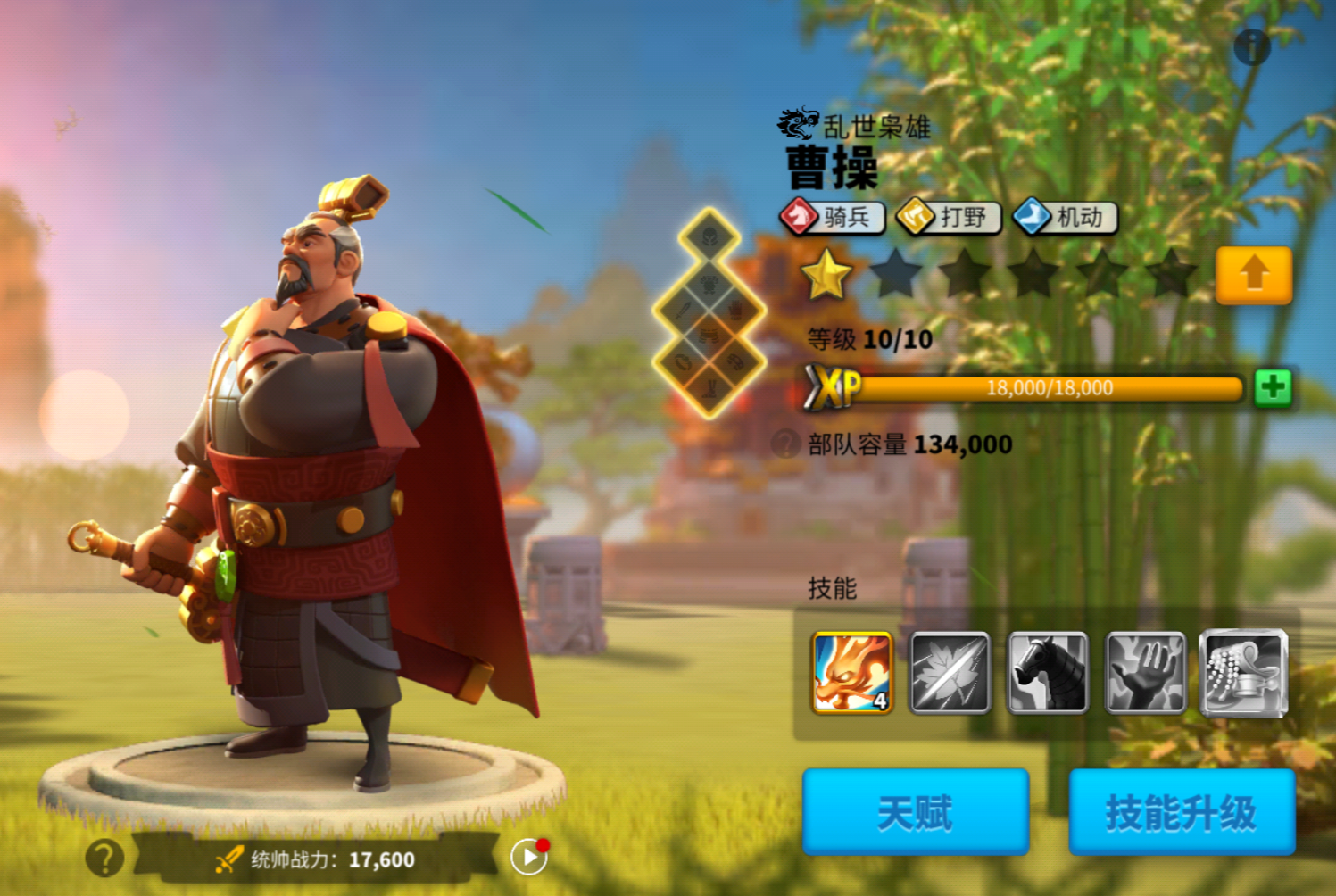 统帅的技能等级是影响部队实际战力的关键。稀有程度越高的统帅,它的同一等级技能强度越大,技能上限也越高,但