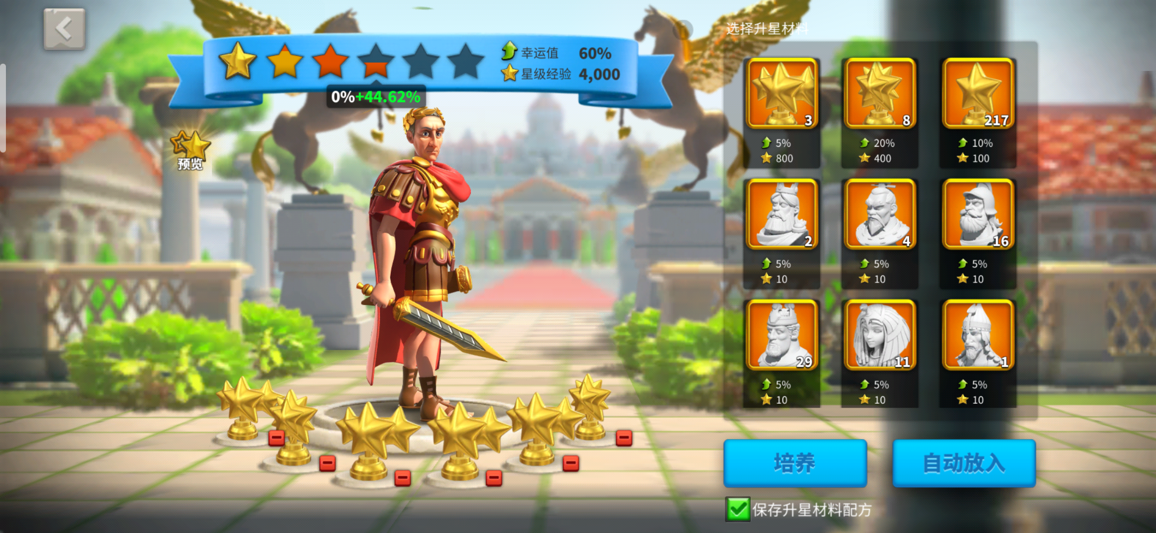 先使用4次单个普通的星星的将经验堆到80%(注意最后一次投入虽暴击几率只有10%,但一旦暴击就失败了),之后升四星需要放置四个一捆星星和两个幸运星星,使经验值达到400,暴击率达到60%,才有较大几率提升到四星。