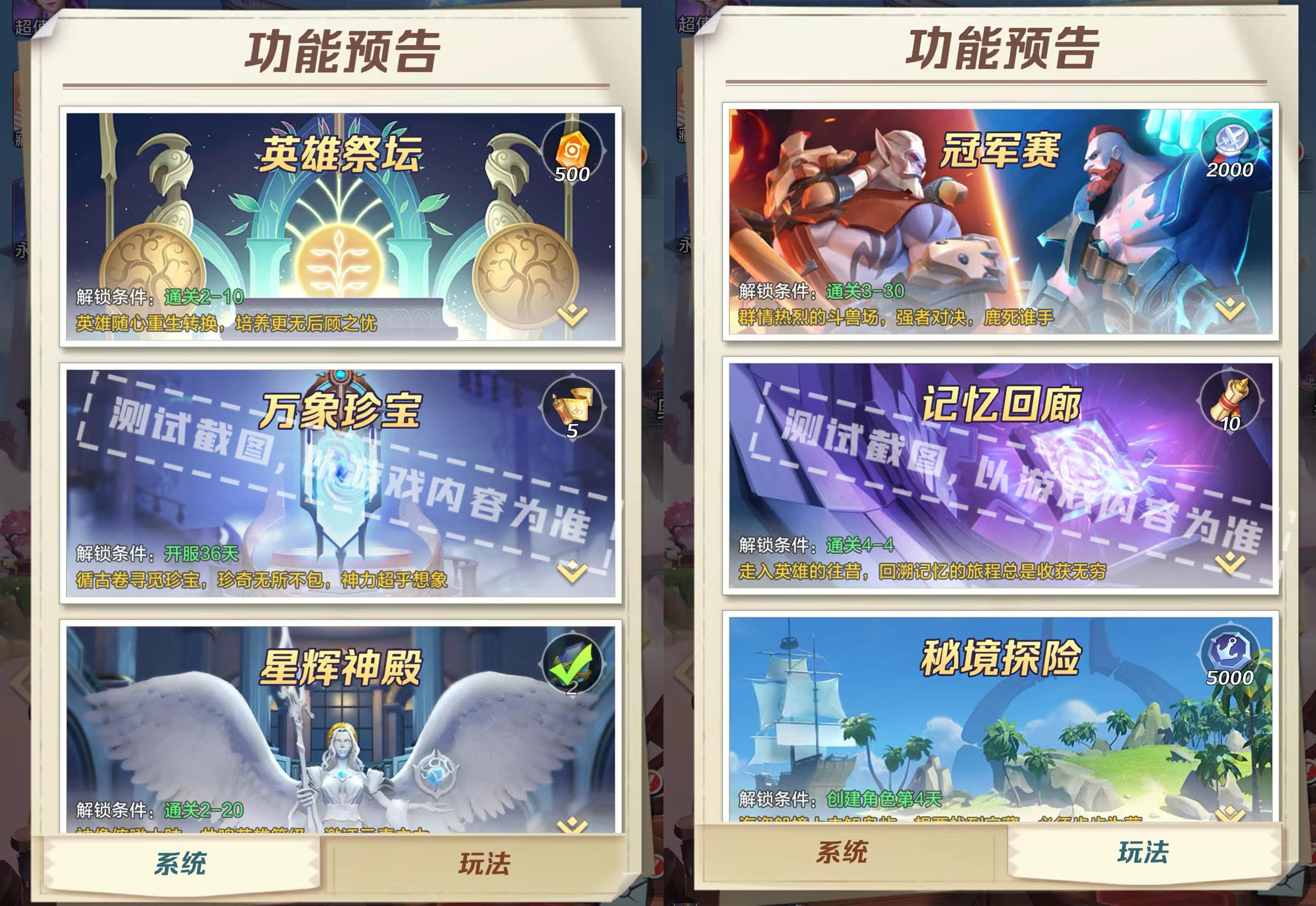 ● 版本维护后,通关2-10的冒险者将解锁“功能预告”系统;完成各项功能、玩法所属的探索任务后,即可领取探索奖励。