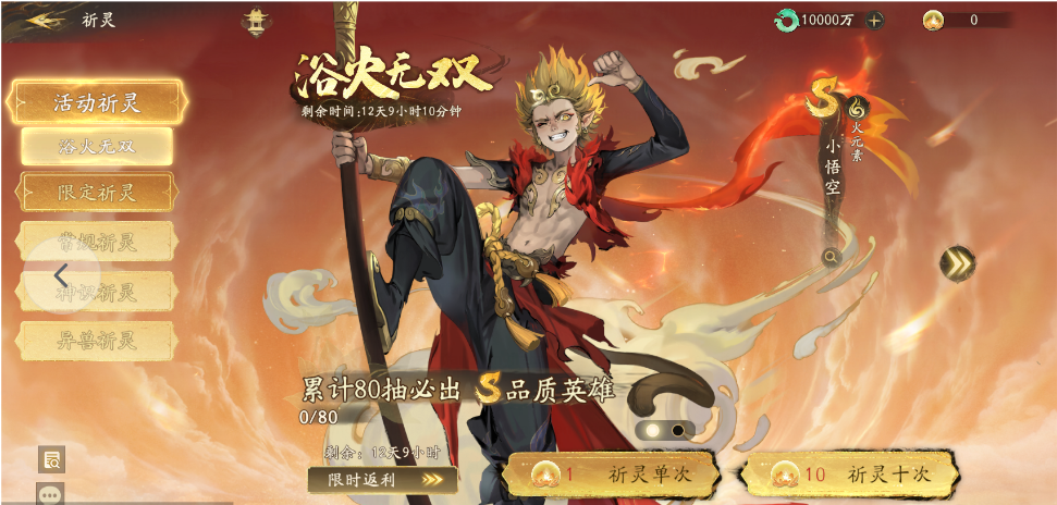 在「浴火无双」 活动祈灵中,小悟空的祈愿概率将提升至50%。如果前一次祈愿出的S级角色不是小悟空,那么下一次祈愿出的S级角色必定是小悟空!