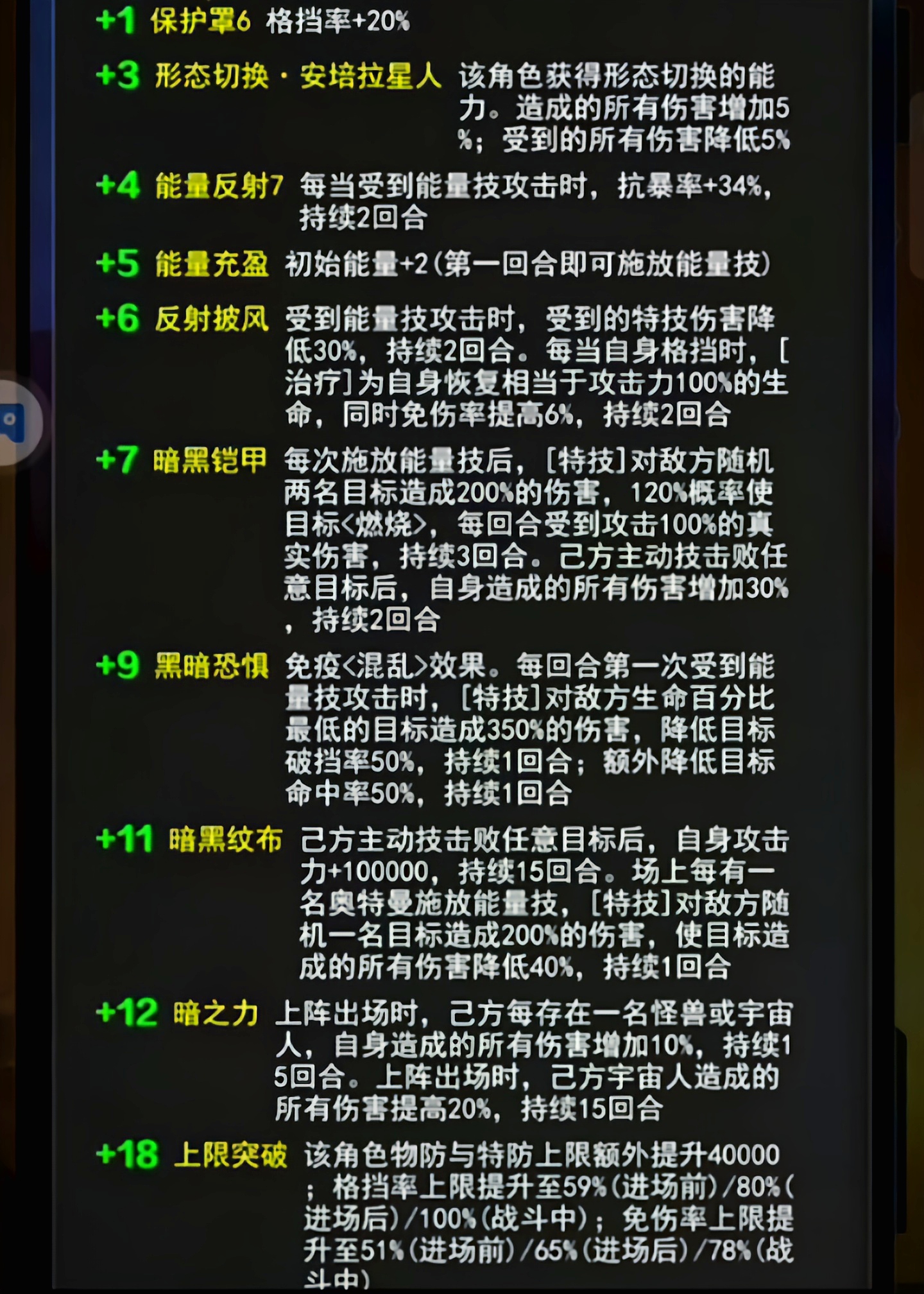 +9 黑暗恐惧免疫<混乱>效果。每回合第一次受到能量技攻击时,[特技]对敌方生命百分比