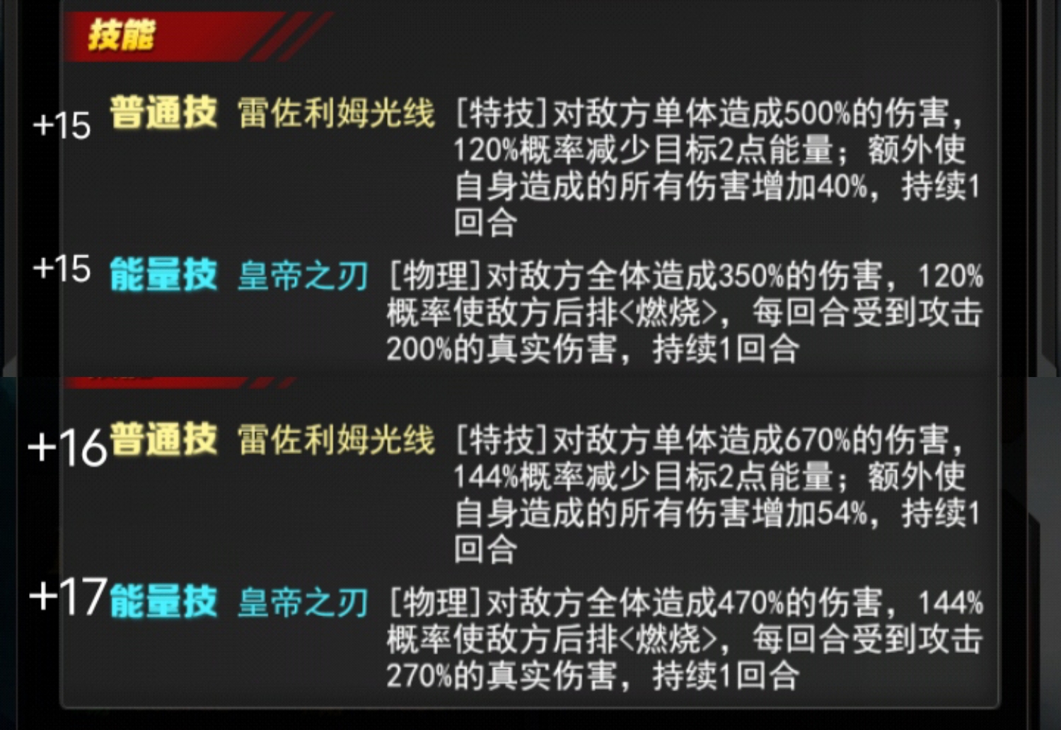 +17能量技 皇帝之刃[物理]对敌方全体造成470%的伤害,144%概率使敌方后排<燃烧>,每回合受到攻击