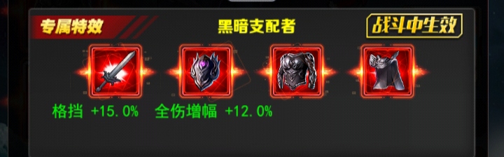 +11 暗黑纹布己方主动技击败任意目标后,自身攻击力+*,持续15回合。场上每有一
