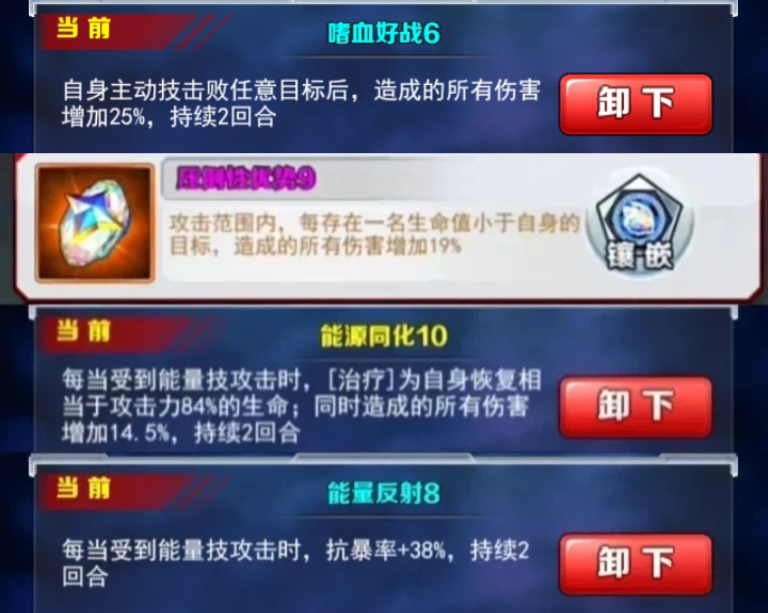 解析:释放能量机后追击敌方,随机两名角色抵比例,伤害高概率的燃烧,每回合受到燃烧伤害100%。持续三回合,乙方主动继击败任意目标,自身的伤害增加30%,这个就是前面所说的嗜血好战了,如果再搭配一个,那就是叠上叠伤害更高。这个反击具有随机性,也不怕卡位