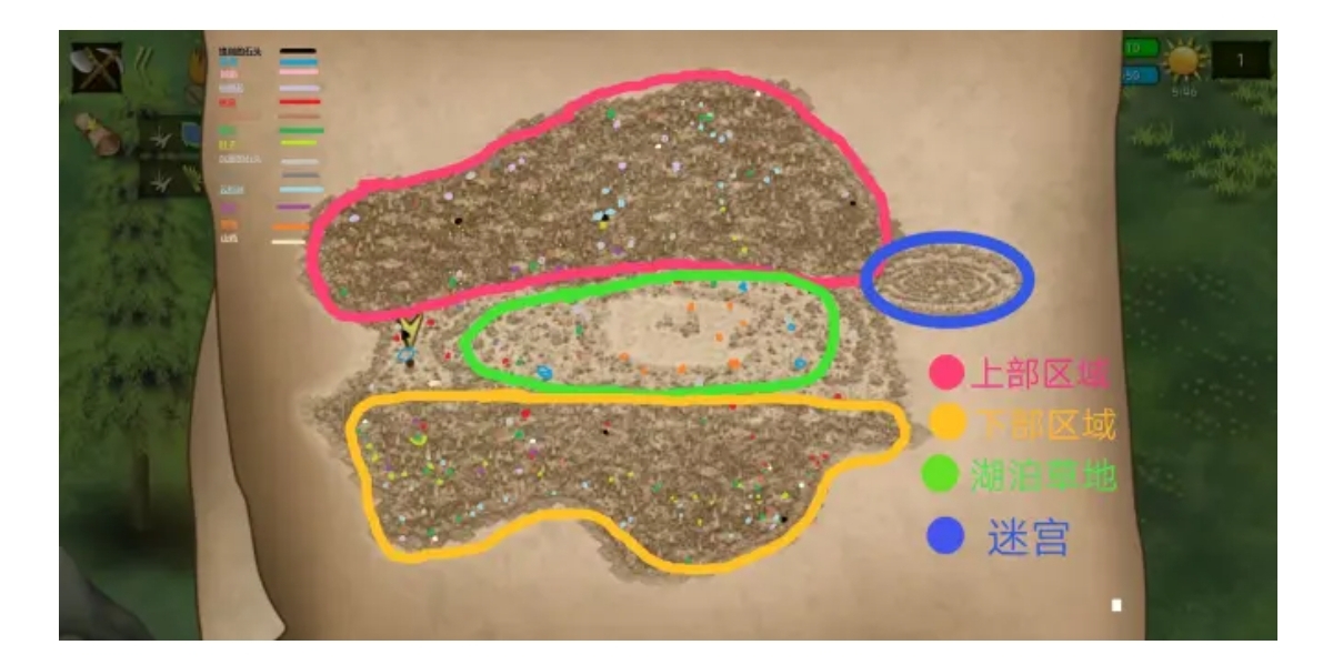 上部区域:这个区域有大量棕榈芯,大叶片,云杉叶,适合前期做营地和蓑衣,但是缺少树皮同时完全没有竹子,这对前期发展有一定影响。蛇和熊都比较多