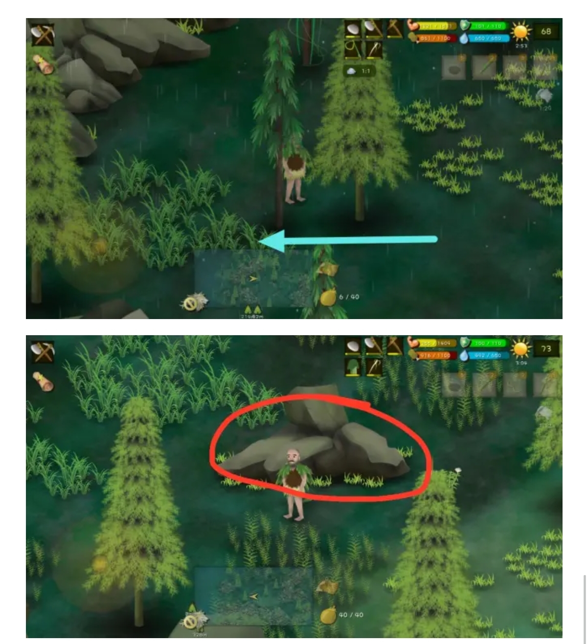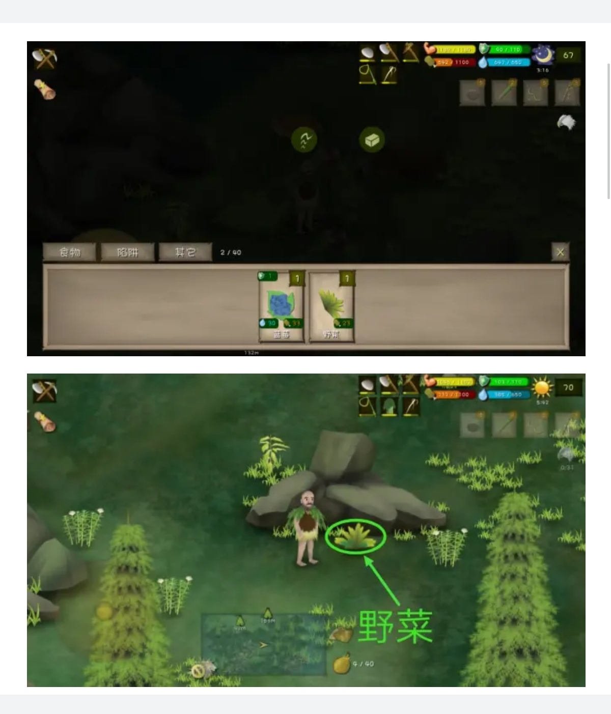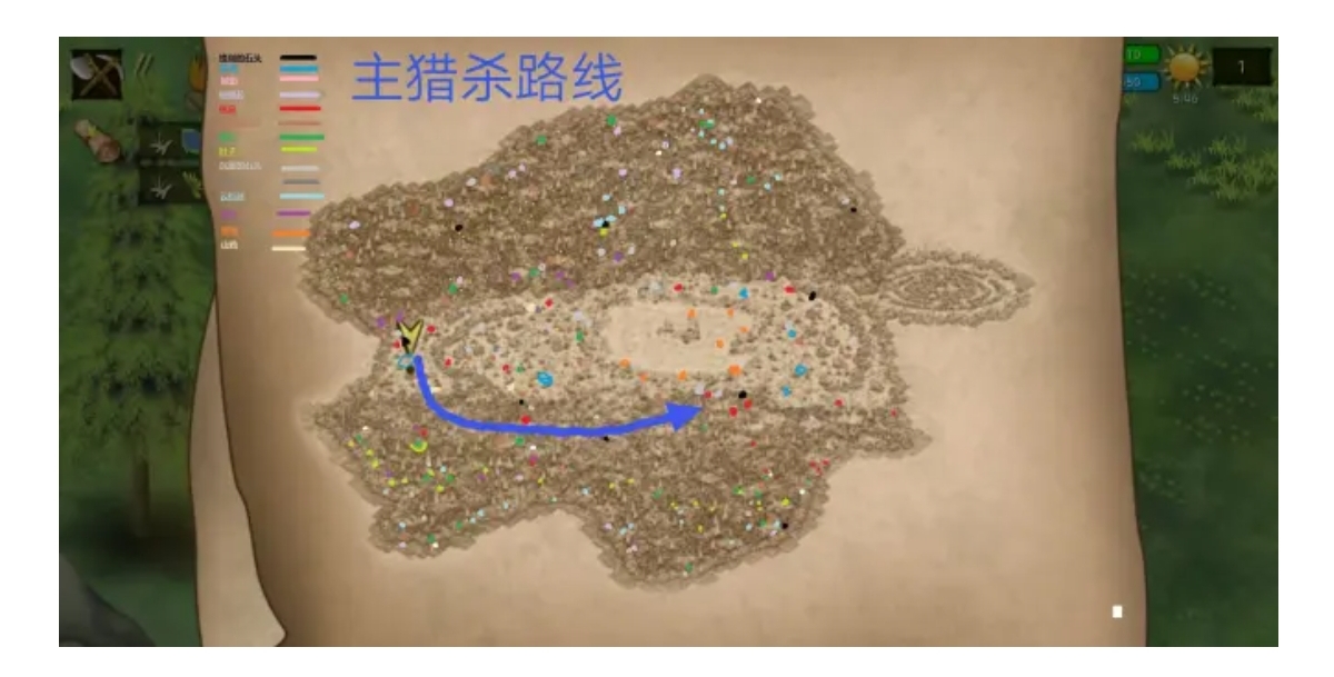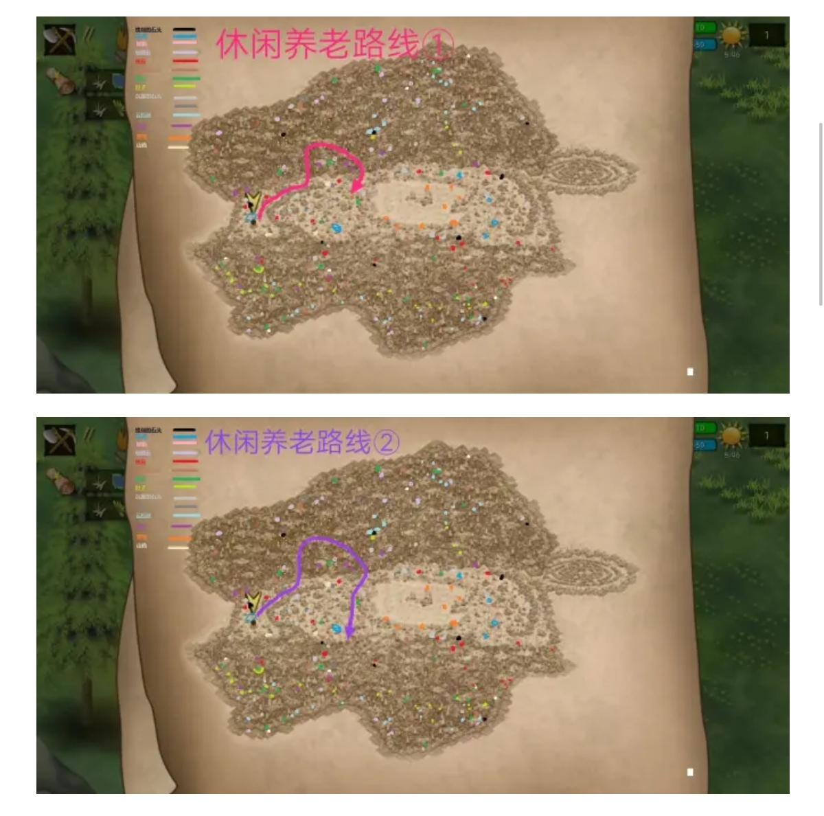 开局往下走一小段拿到一个锋利石之后,直接上走,直到第一片云杉林,拿一些云杉叶和大叶片。这里说一下制作顺序:工具→蓑衣→营地→陷阱(→猎杀陷阱),开局猎杀也可以。选择这条路线可以获得大量大叶片和云杉叶,方便建营地。但是前期弄不到竹子,所以推荐后期把路线二的营地也建了,需要竹子的时候去下面,需要大叶片云杉叶的时候就去上面。