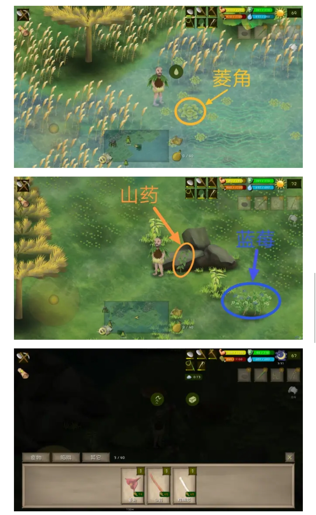 碳水主要靠这3种,高山碳水数量比较多,迷宫里有大量山药,林地又有大量棕榈芯,湖中有菱角