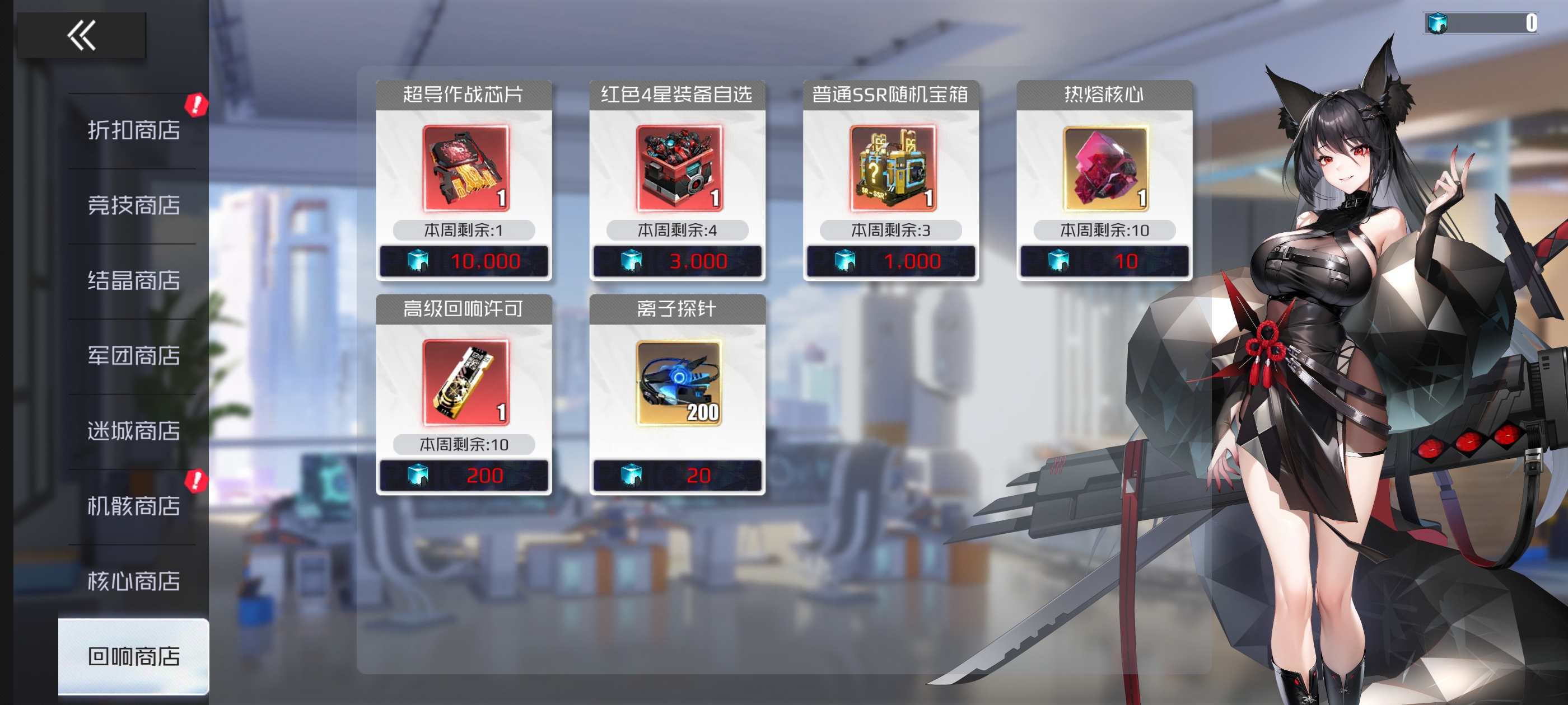 这个商店是依托限时抽卡的活动也叫做限时回响获得。这里就要提醒小氪零氪微氪的朋友们一定要屯回响,最好屯到可以用回响碎片换红色芯片的时候再去抽。当然如果可以忍到可以抽五星也行,毕竟抽到五星可是有送一个皮肤,还特别好看。