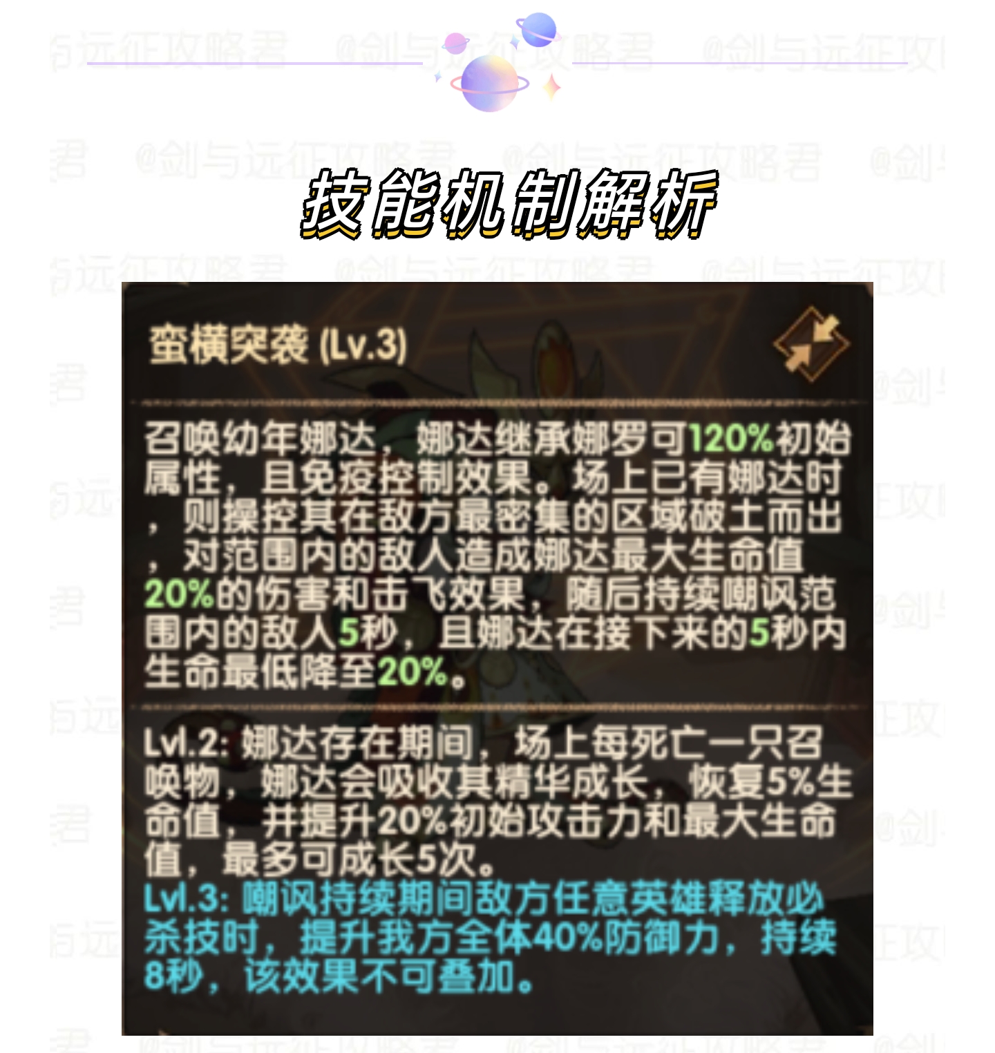 嘲讽期间敌方英雄释放必杀技时,还提升我方全体防御。