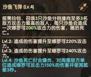 召唤沙鱼分别攻击至多3名敌方攻击力最高的敌人,简单粗暴的伤害技能。