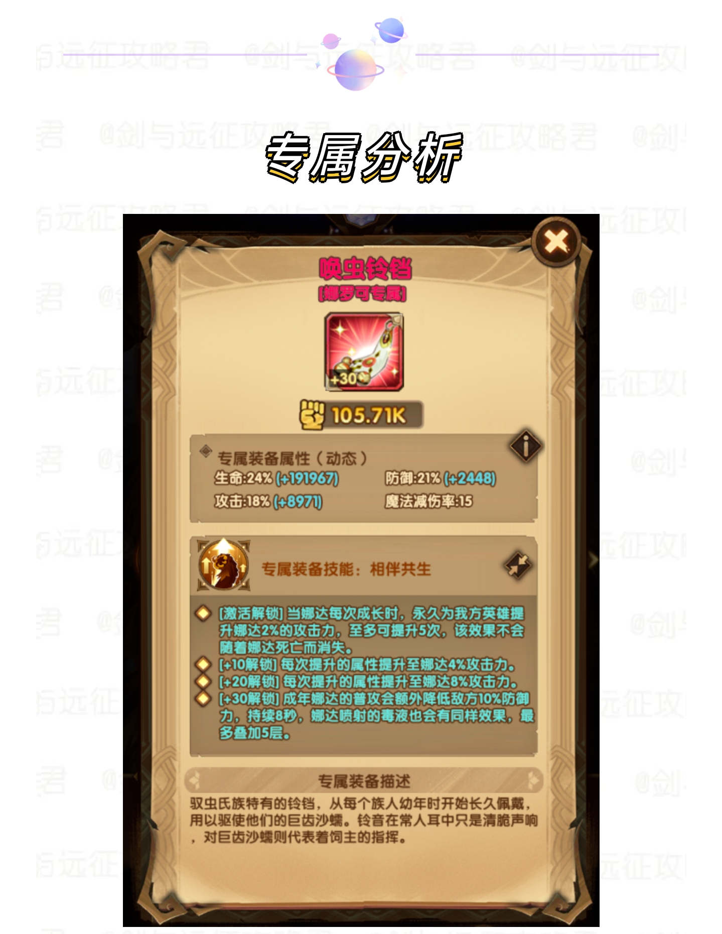 60刻印 大虫子进化为成年体时,将立即对周围敌人喷射五次毒液。随后每死亡3只召唤物,下一次普攻变为喷射3次毒液,需要搭配有召唤物的队友才能最大化收益,先30专属再考虑60刻印。