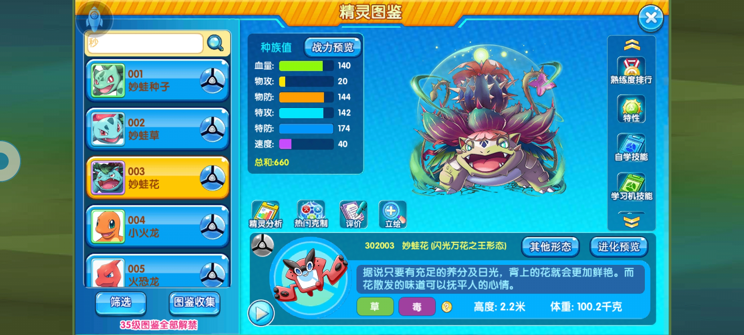 妙蛙花是四足的爬行动物类精灵,妙蛙花的头顶有一对耳朵,耳朵内部为红色,眼睛仍然呈橘红色,口腔里除进化前就有的上排两颗尖牙外,下排两侧又各长出两颗小尖牙。它背上的花蕾现在盛开成一朵巨大的花朵,由一根类似棕榈树的浅褐色树干状物支撑,新加强的妙蛙无论是选择物防还是特防都是一个优秀的肉盾,可以说是当下版本的优秀盾牌,丰富的骚扰技能也提供了多种功能,总体来说妙蛙还是很有可玩性的一只精灵,本期攻略就到这里,大家再见。