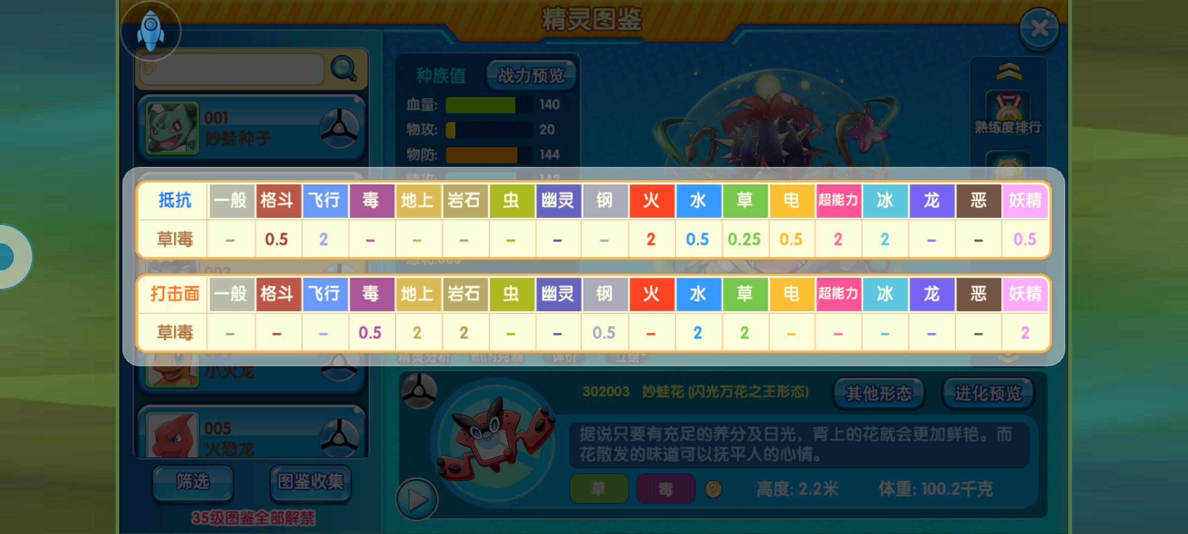 妙蛙作为草+毒系的精灵,弱点原来一共有4个,分别是飞行,火,冰,超能力。但是大肥脂这个特性彻底改变了妙蛙花,让它飞行系、火系以及冰系这三个属性弱点被大幅度削弱,相当于只有一个超能系弱点,抗伤和容错能力大幅度加强,面对目前强势物攻手古拉、刃鬼这些,妙蛙都有抵抗之力,这些攻击妙蛙可以轻松的接下来。妙蛙花的特防和物防都具有非常优秀的种族值,并且抵抗电系、妖精系、草系、水系、格斗系这五大热门属性。路卡利欧、妖精鹿等宠,打妙蛙非常费劲,还有海皇牙、杰尼龟也一样,特性带来的减伤更是让妙蛙花的防守更出色!所以说妙蛙花这个毒草属性并不强势,本身抗性并不是很优秀,但是配合大肥脂特性就弥补了部分弱点的问题。