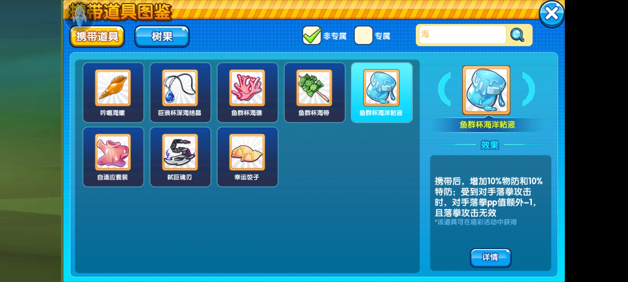 我个人比较推荐海洋粘液,提升肉度同时还不怕落拳,我带的树果是心灵药草,为了抵抗一次挑拨等技能的控制。