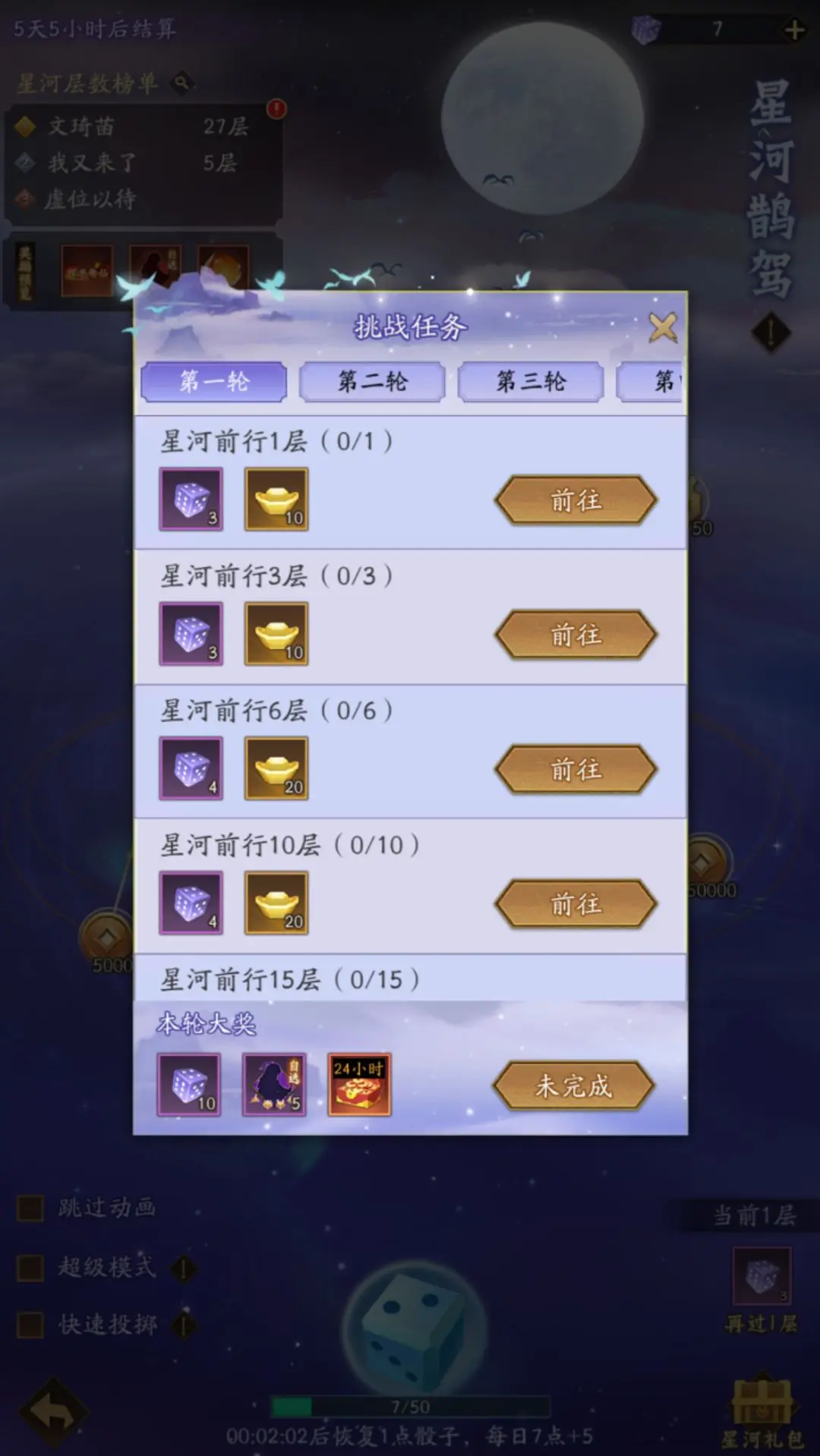 星河鹊驾每层开始时都需要选择一个该层的最终奖励,点击骰子图标进行投掷后,牛郎将向前行走点数对应的步数,所经过路径上的所有奖励都将为道友收入囊中,而当走完本层全部格子数后道友们就可以领取本层的最终奖励并进入下一轮啦!