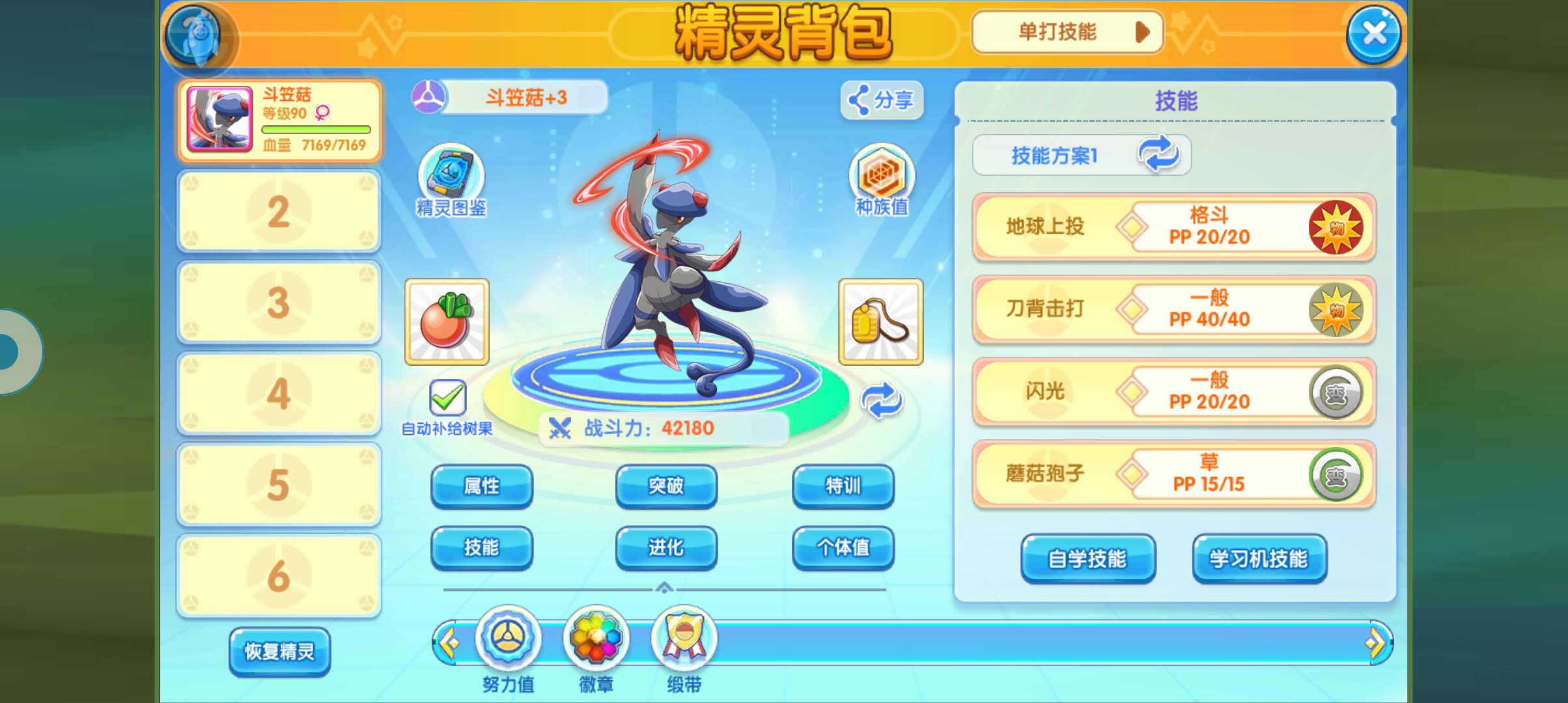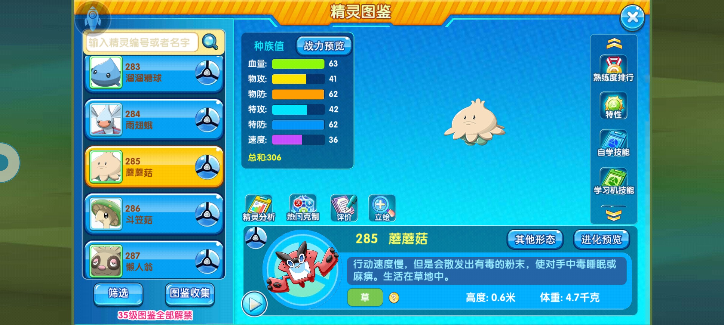 首先,这个宠物的抓捕能力我个人认为是整个游戏里面最强的,本身拥有蘑菇孢子,可以100%催眠对面,只要自身的速度线比野怪快,基本上都可以做到先手催眠,然后利用刀背击打,慢慢的把对面的血量磨下来,剩下需要做的就是无脑扔球,基本上可以说是一个精灵,就可以把对面的野怪给单刷全部抓走。