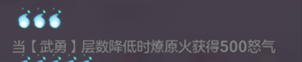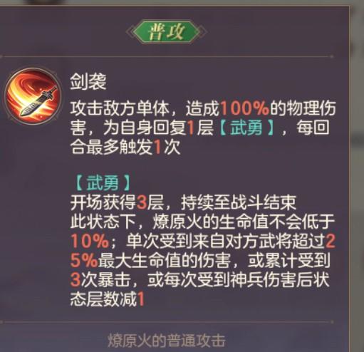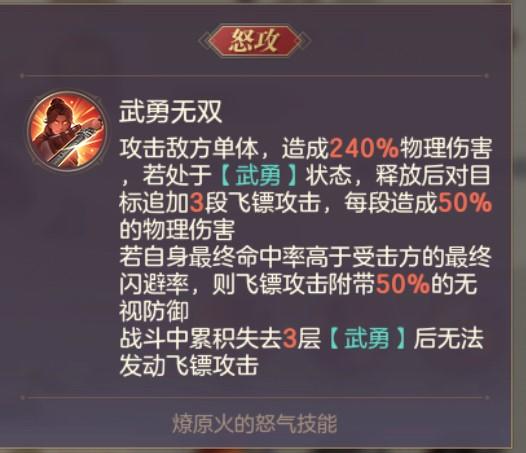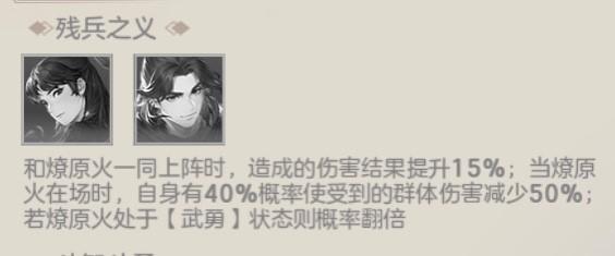 根据技能组可以看出,燎原火定位是后期输出武将,输出能力会随着对局的进行逐渐提高,到了三回合(五火后)是质变节点,对于前两回合的孱弱,燎原火选择用“武勇”免死属性和高额的闪避率来保障自己的生存,然后伺机而动,厚积薄发,在后期通过闪避附带的高频反击,实现防守反击,击破对手。