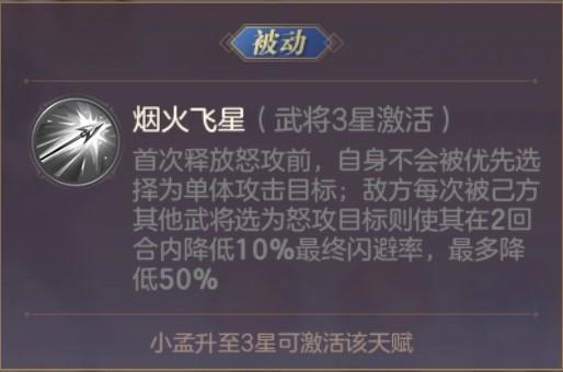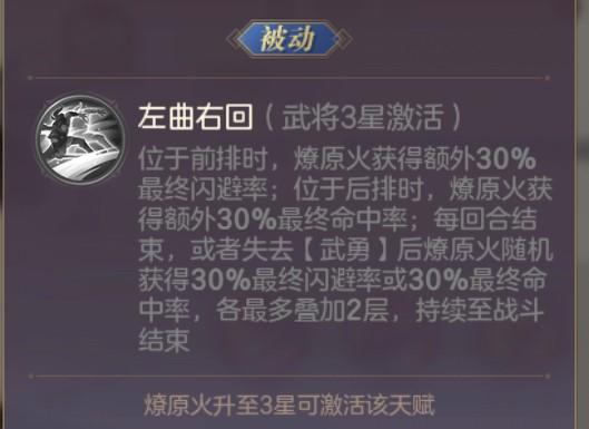 站位方面,燎原火无论是生存还是输出都非常依赖“最终闪避”属性,因此根据三星被动效果,前排站位是燎原火的不二选择,后排站位推荐度很低。