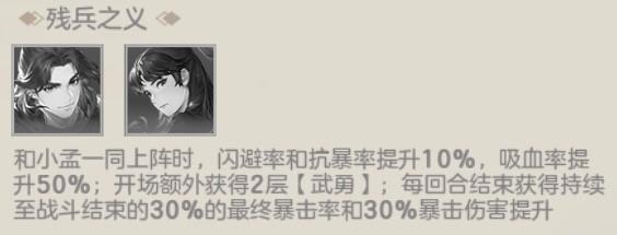 小孟的技能组强度比较堪忧,虽然看起来可以点杀可以控制可以联动毒体系,但是每个分支都仅仅做到浅尝辄止,没有明显的长处,所以在成熟的养成环境,小孟很难出人头地,但是由于燎原火的羁绊效果非常关键,所以燎原火基本需要绑定小孟出场,这在一定程度上削弱了燎原火的强度。