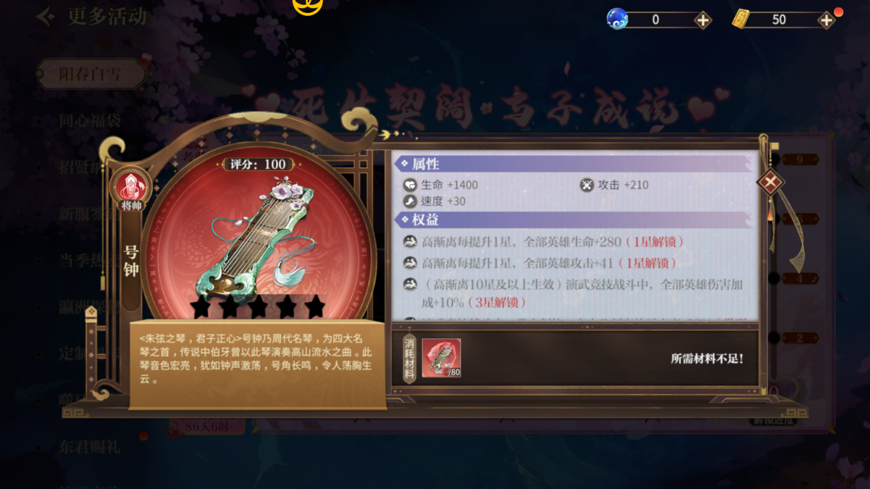 高渐离相关奇珍,名曰“号钟”,为四大名琴之首,传说中伯牙曾以此琴演奏高山流水之曲。此琴音色宏亮,犹如钟声激荡,号角长鸣,令人荡胸生云。持有此奇珍后,高渐离每次升星后,都可为全体英雄提升生命、攻击等属性。且当高渐离达到10星后,在演武竞技战斗中,全体英雄伤害加成也将提升。