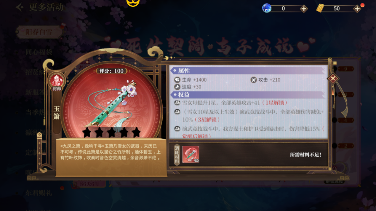 雪女相关奇珍名为“玉箫”,是雪女的武器,来历已不可考,传说此箫是以昆仑之竹所制,通体碧玉,上有竹叶纹饰,吹奏时音色空灵清越,余音渺渺不绝。