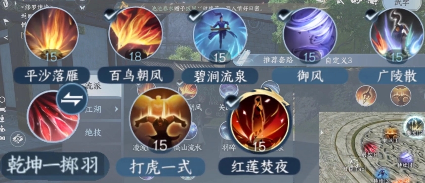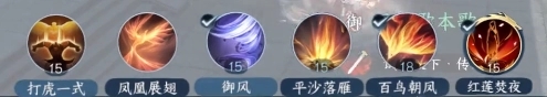 开局先刷满三火,五火都行,起手打虎一式,凤凰展翅,触发炽热,接御风触发火风,触发内功等多种状态,接平沙落雁,百鸟朝凤三段打完,如果有刷新,接着放白鸟,放绝技。