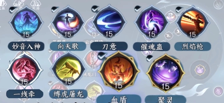 神相本职业的妙音入神、向天歌、偷师碎梦的刀意、九灵 m的摧魂蛊、血河的烈焰 m枪。备用的有相思门的一线牵,丐帮的缚虎屠龙。精通特质九灵/血河二选一。