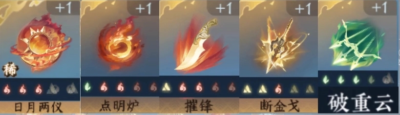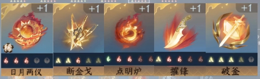 三火两金一木,日月两仪、点明炉、摧锋、断金戈、破重云。