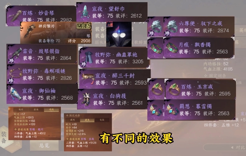 头盔,腰带,护腕,鞋子,75装等宣夜套,根据不同情况选择不同的套装属性有不同的效果。