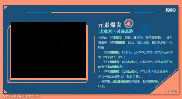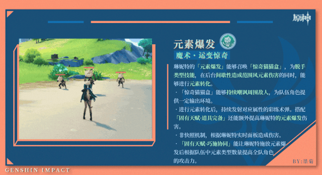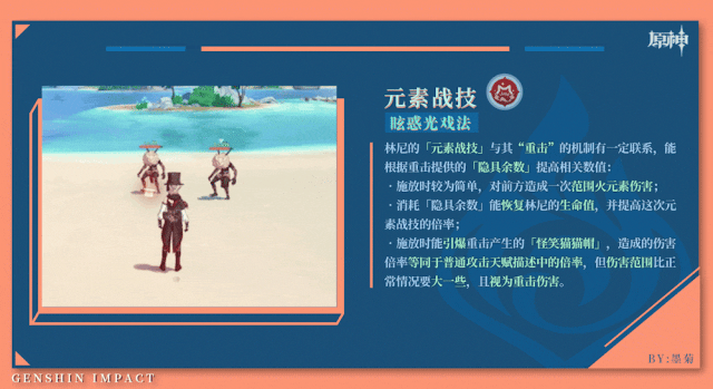 突破增加「暴击率」,与同期up的武器「最初的大魔术」副词缀互补,提高林尼的暴击期望下限。林尼的固有天赋,一是强化了重击的倍率,二是强化了对“火元素附着”下敌人的伤害,根据队伍中“火元素角色的数量”至少为60%,至多提升100%。
