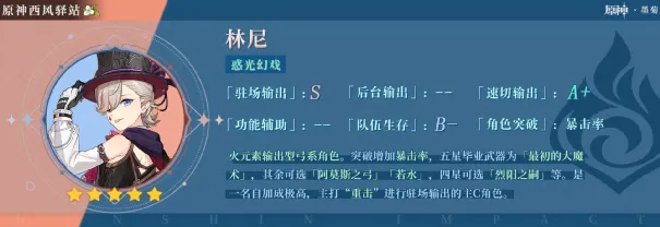关于抽取的建议:作为枫丹的第一位五星角色,林尼的机制适配新圣遗物,加上其略显苛刻的增伤天赋,使得林尼具有非常暴力的基础面板。但想发挥出林尼所有的潜力,还需要一个比较完善的队伍搭配。不过对大世界而言,林尼自身拥有极高的基础加成,加上生活天赋有材料的标记,对于刚入坑的萌新而言用来探索是非常不错的输出角色。