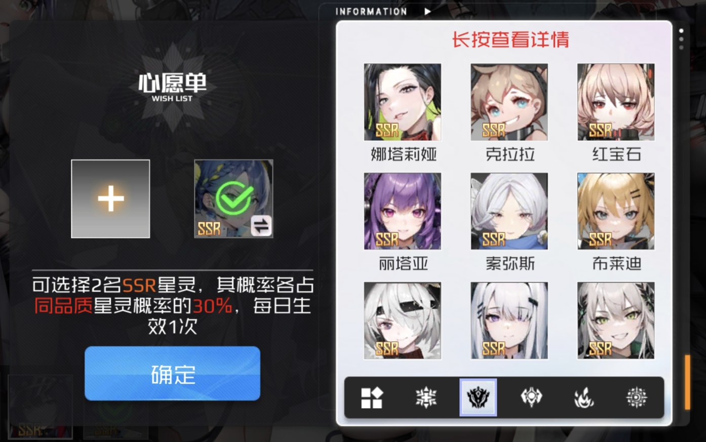 心愿单优先设置【娜塔丽娅】和【索弥斯】。