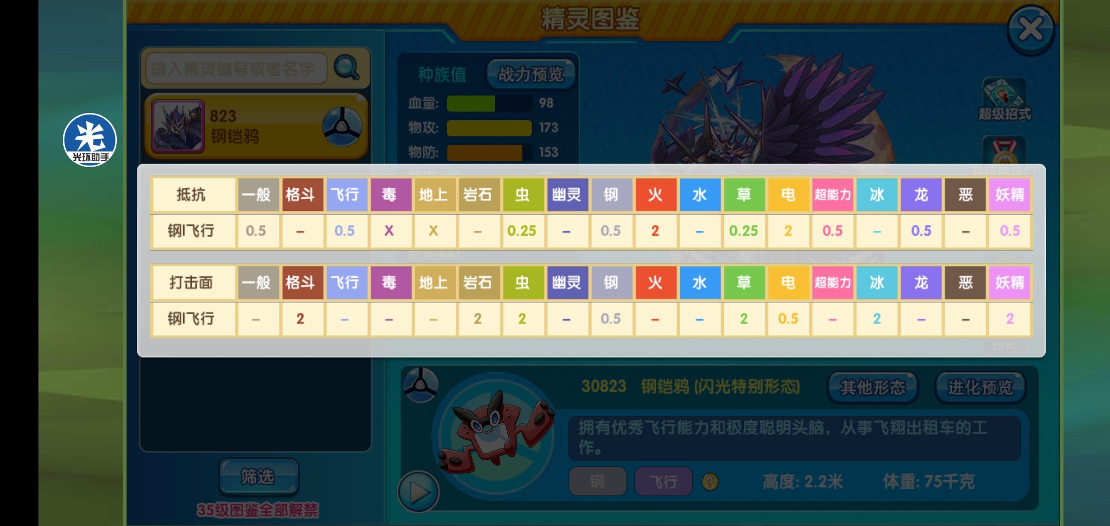 抵抗一般系、飞行系、虫系、钢系、草系、超能系、龙系、妖精系,免疫地面系和毒系,弱二倍火系和电系,可以说这个属性组合非常强大,弱点里面只有火系是热门打击,基本只要规避好特攻火系宠,比如火鸟,其他的都可以拉血消耗,这就给它的生存能力有了强力保障。