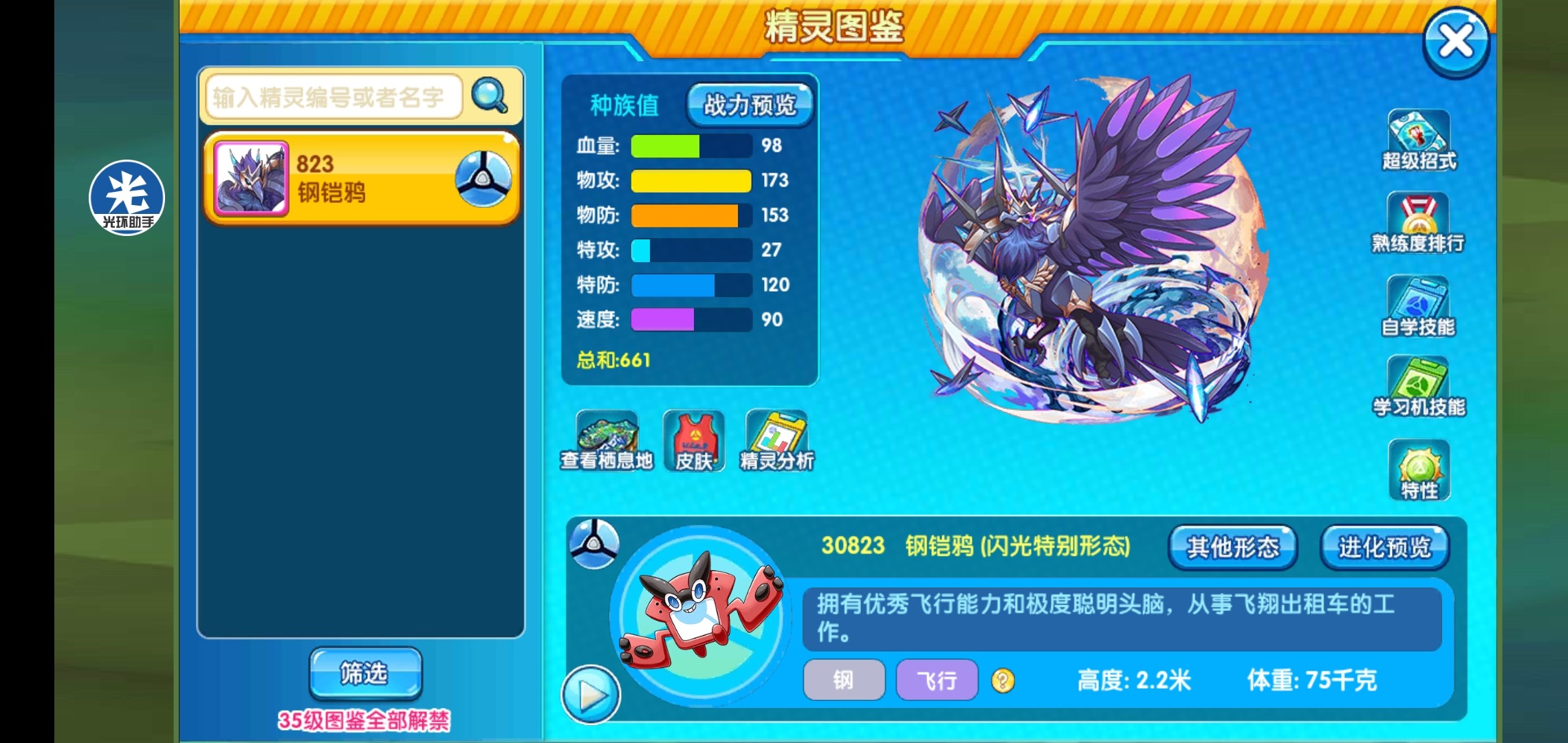 钢铠鸦是第八世代家门鸟,也被大家称之为历代以来最帅气的家门鸟,它还具有单独的超极巨化形态,可以让身上的钢铠得到强化,翅膀变得极为巨大。受超极巨化之力影响,覆盖在翅膀上的钢铠与本体分离,变为能够独立飞行的 “刃鸟”。而复刻中除了无极汰那,其他宠都没极巨化,但是凭借它强大的专属特性,依旧可以在PVP环境风生水起,关键它的价格还非常低。