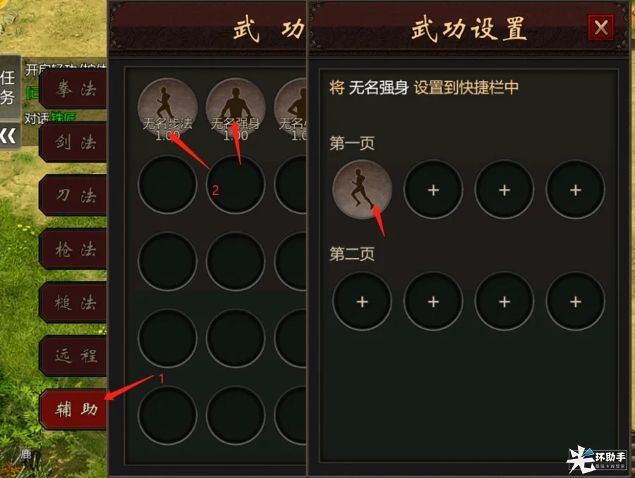 2、装备斧头(打开包裹装备上斧头,顺便装备好衣服)3、选择奖励(先一个自己前期想修行的武器即可,推荐斧头)4、开启轻功和护体(在打开武功界面后需要点击——辅助——使用无名步法和无名强身,这里推荐将无名步法设置到快捷栏——将设置里自动护体设置为自动释放无名护体)