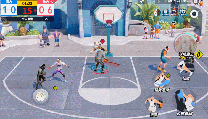 扬尼斯的主要得分技能。当持球进攻位于篮下左右两侧时,点击“字母反扣”,扬尼斯在篮板两侧强起,长臂越过篮筐将球扣进。