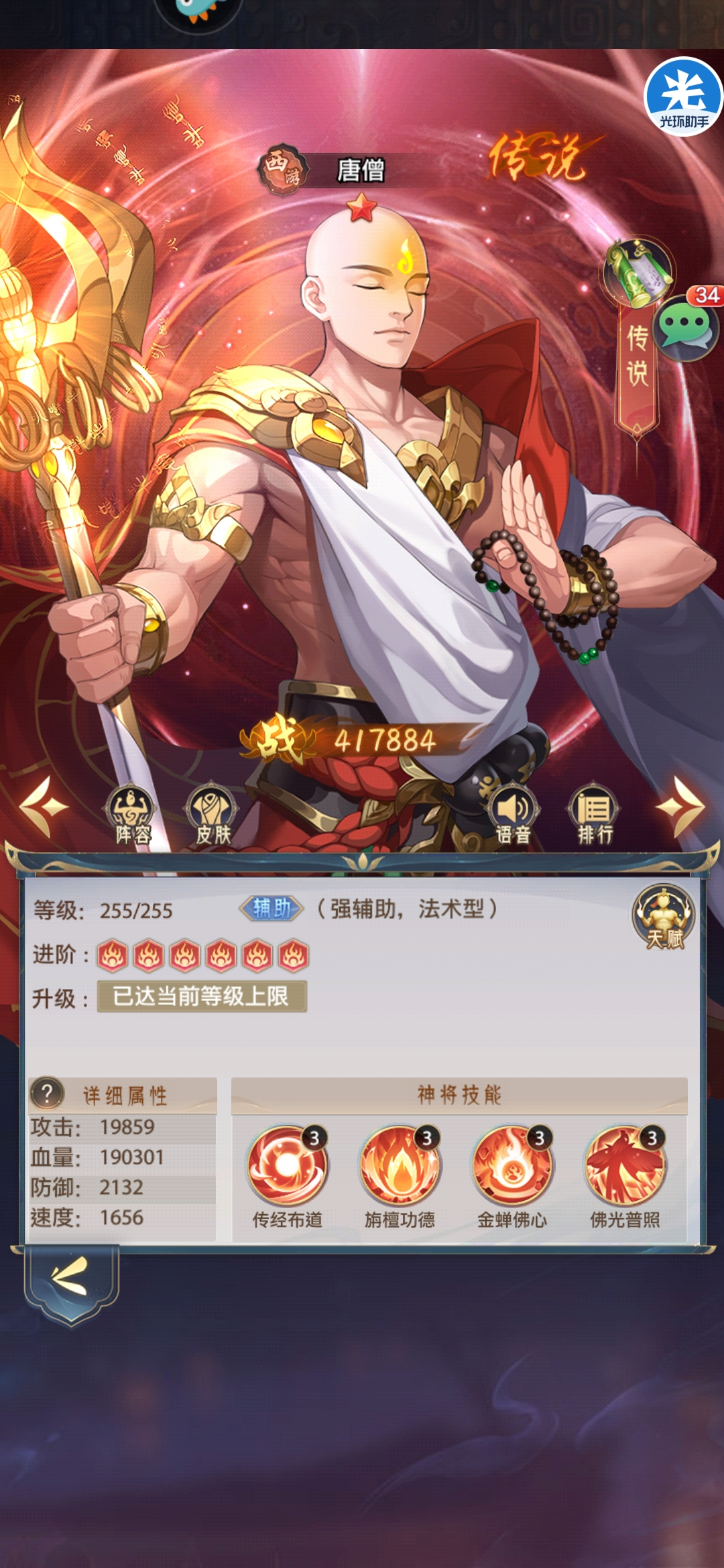 西游强势辅助,唐僧拥有不错的驱散负面效果,可以通过调整阵容速度保证唐僧在主力优先出手,保证主力良好输出环境,同时增攻增爆大幅提升主力输出阈值;同时唐僧拥有不错的复活机制,可以提高阵容容错率