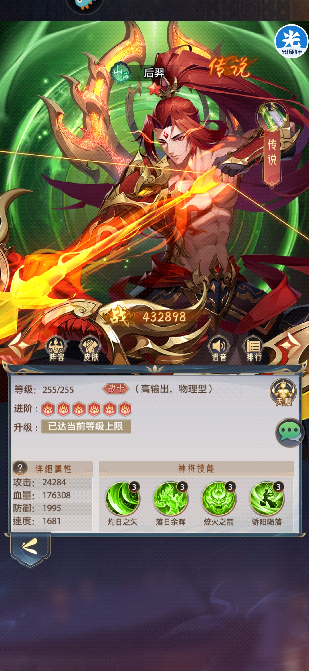 山海阵容核心输出之一,超强的锁头单体输出模式,技能可以针对攻击最高单位和残血单位,兼顾收割和消耗效果,同时技能分别附带的降低攻击和限制治疗可以完美针对敌方武将,技能机制恰到好处;但后羿续航能力略弱,可以配合盘古被动提高自身坦度