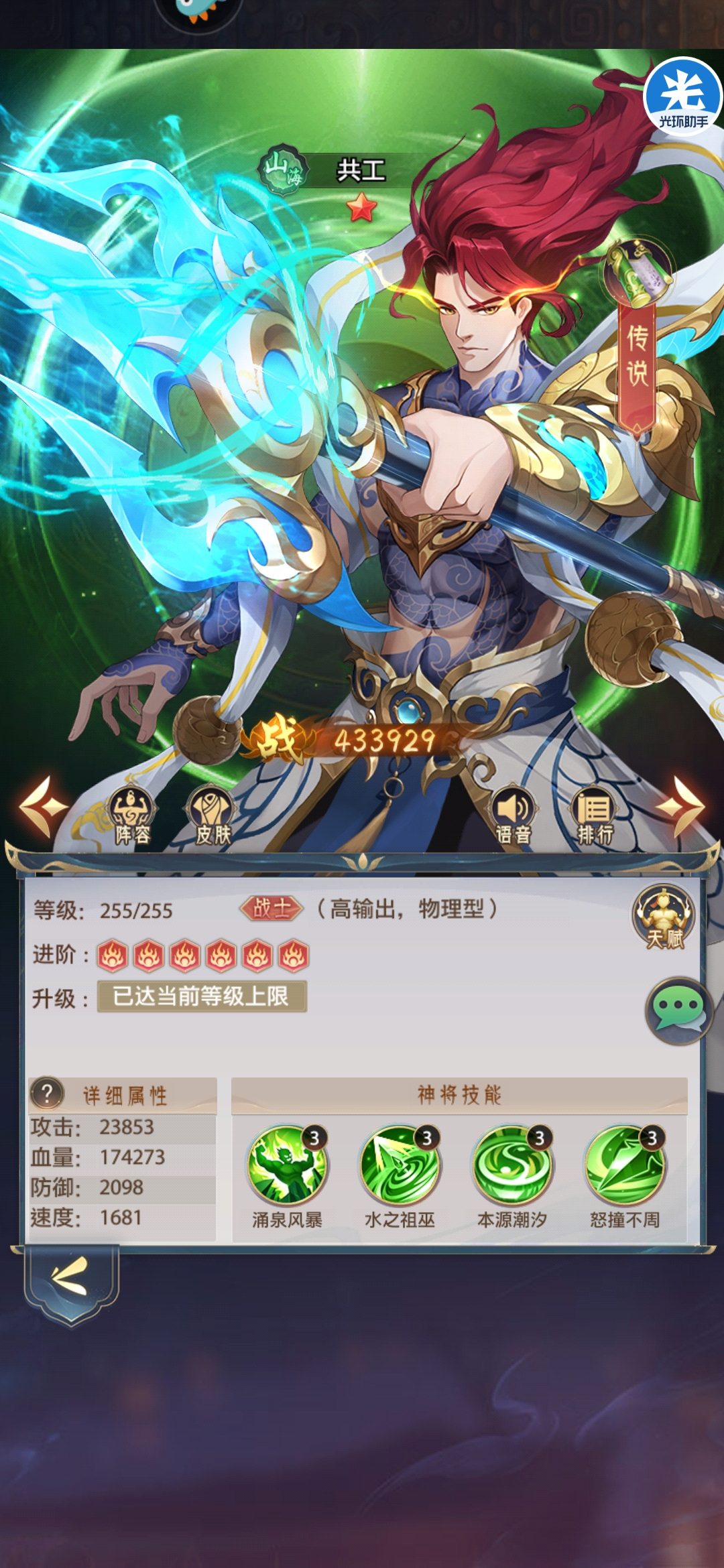 山海核心输出武将之一,兼顾主动伤害和被动反击效果,拥有超强续航能力反打能力极强,共工受击拥有高系数伤害反击同时附带不错的吸血效果,配合减伤坦度极高,同时三技能半血亦拥有不错的吸血效果,可以保证自身生存能力