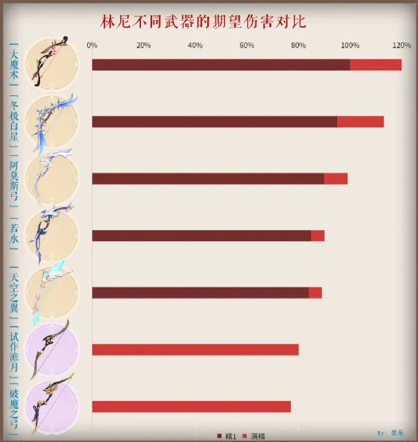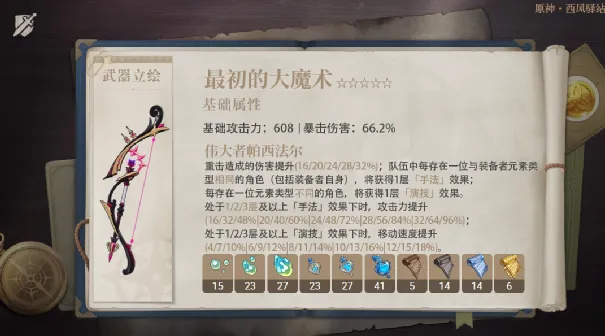 武器特效上,虽然生命值对大部分弓系角色并非有效输出词缀,但触发条件简单的全伤加成也比较令人心动,不过整体的精炼提升就显得略低一些了。