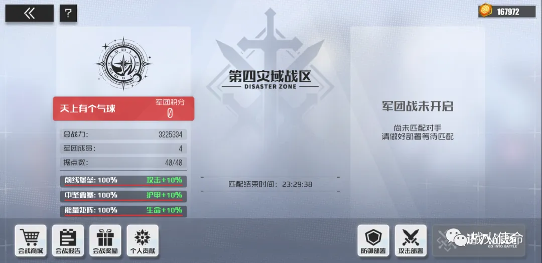 『军团会战』为战火使命推出的全新多人对战玩法,以军团为单位参加。该玩法总共分五个阶段,包括前期准备、军团匹配、团长布阵、战斗开启及战斗结束后的结算阶段。战斗胜利后,可通过获得的积分领取和兑换奖励。