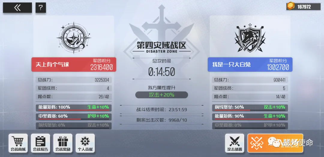 ◆ 战斗结束后,回到战区主界面,即可领取奖励和积分兑换,并查看战斗记录、个人排名以及敌方军团建筑和据点剩余情况。