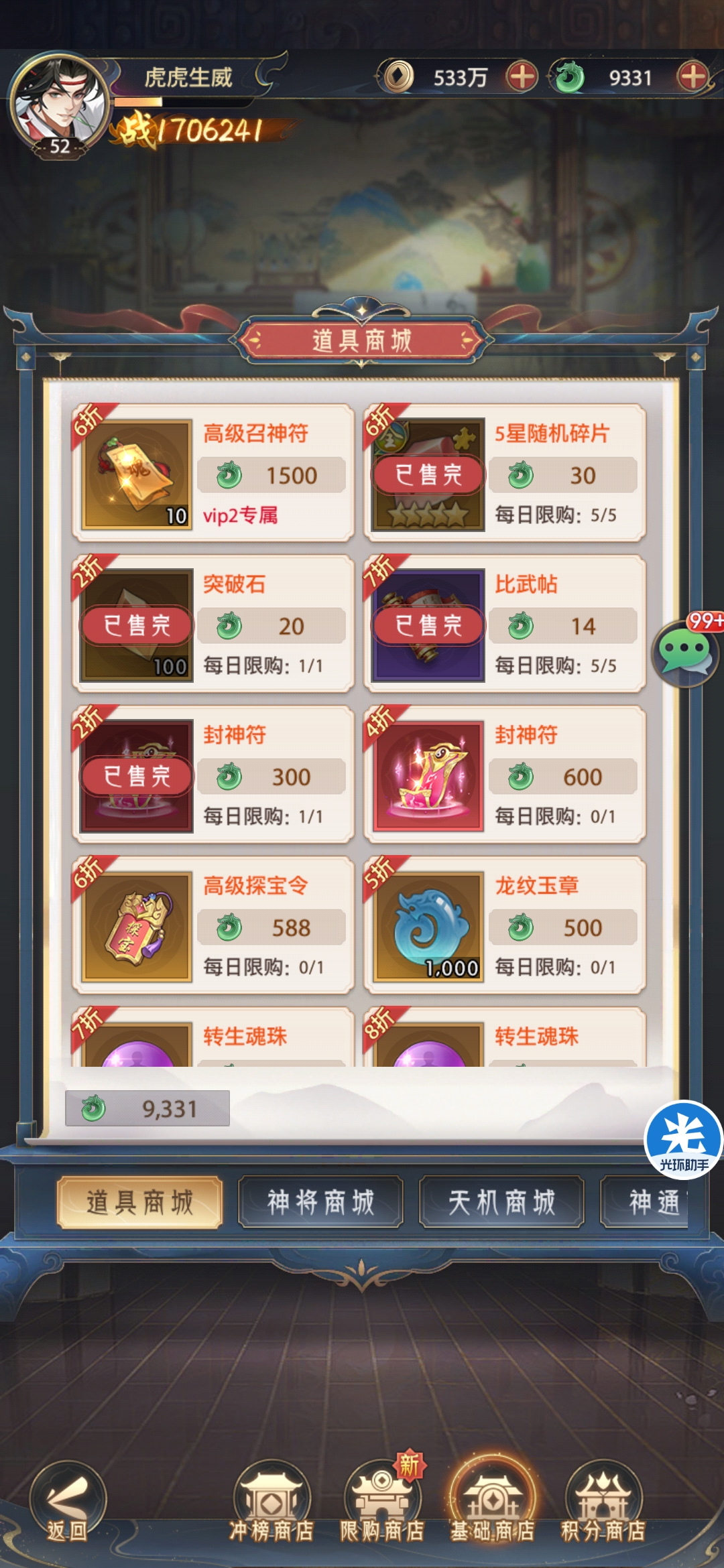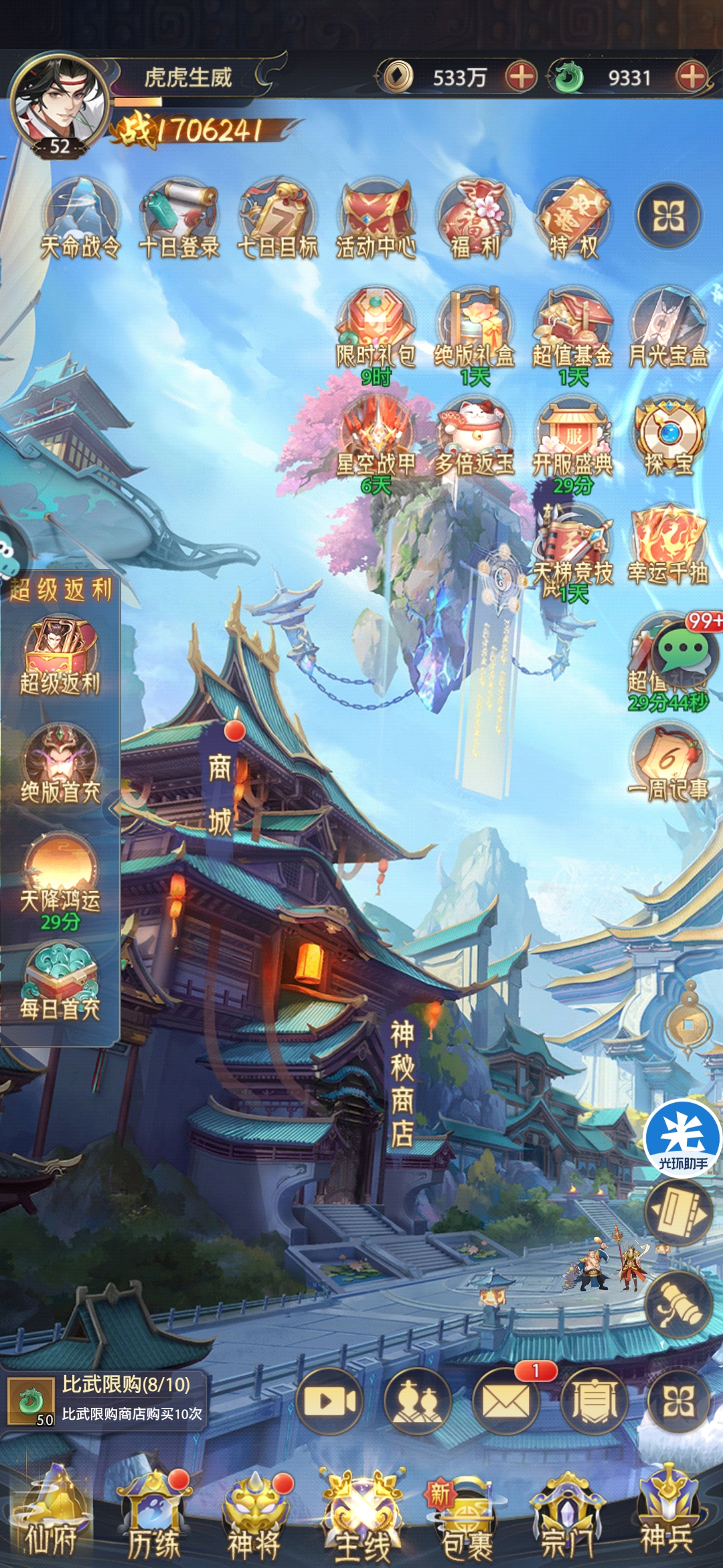 建议每日商城将便宜的商品全部购买,可以刷总商店购买次数,可以保证满星计划中商城任务完成,更快获取积分;第四天可以考虑将牛魔王重生一次重新升级,可以完成天命战令的消耗8000万经验任务,获取2000积分奖励;轩辕积分可以商店兑换神兵技能石,提高神兵积分获取奖励