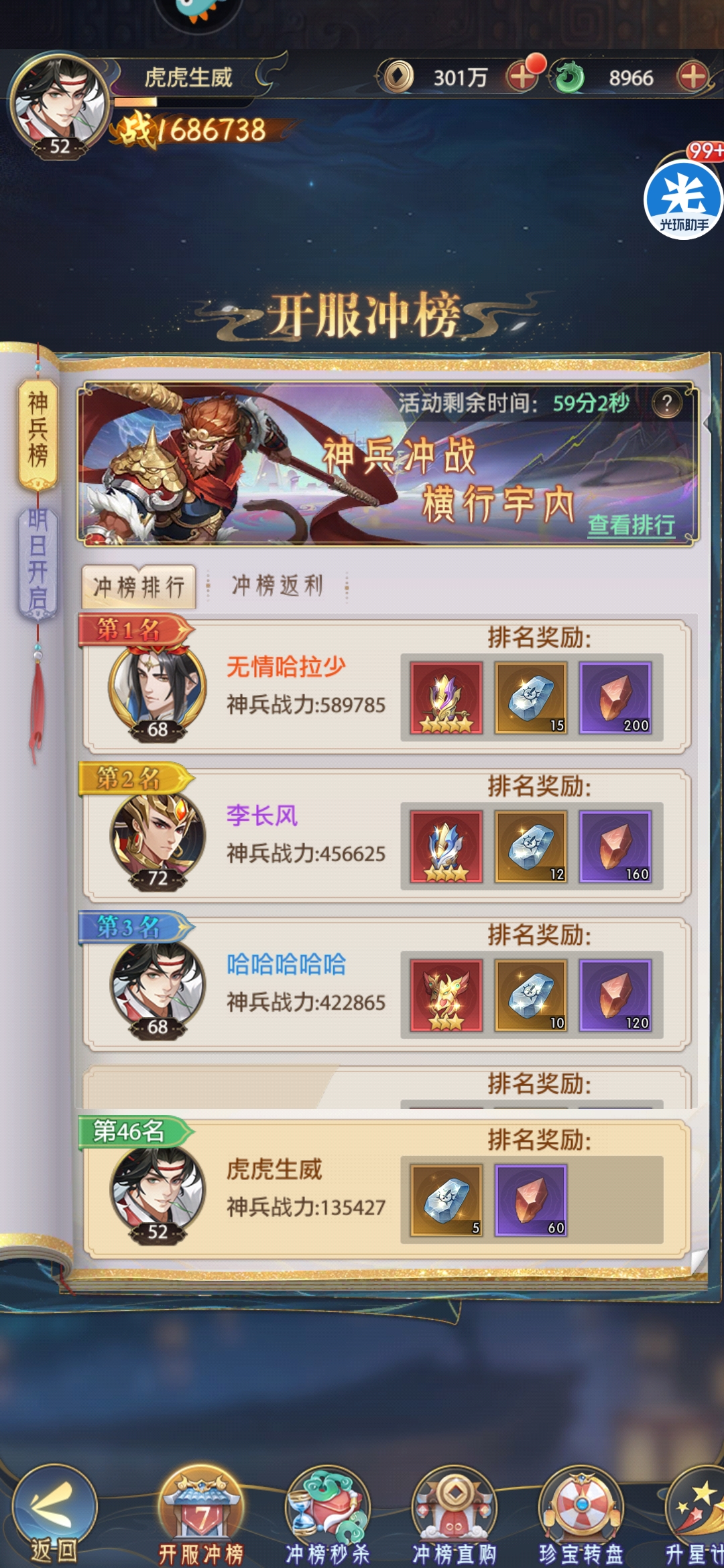 第四天根据上线赠送大量抽卡劵可以升星九星牛魔王,将哪吒等级重置使牛魔王达到最高等级205级,随后可以进行通天塔、幽界炼狱等PVE玩法通关,由于牛魔王战力可以达到55万+,以上玩法均会有不错突破,如果卡关可以参考上述占位技巧,前排一定要肉可以事半功倍,其他和日常一样