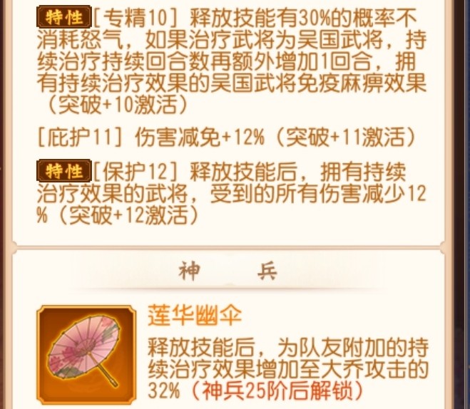 那就是你把一个小乔放在偏将位置上的突破10的庞统直接让他在六号位一般都是会死的配合偏将的特性可以一次性拉四次大乔奶量直接把免伤拉满可以一试。(四次持续治疗以及48%的高额免伤)