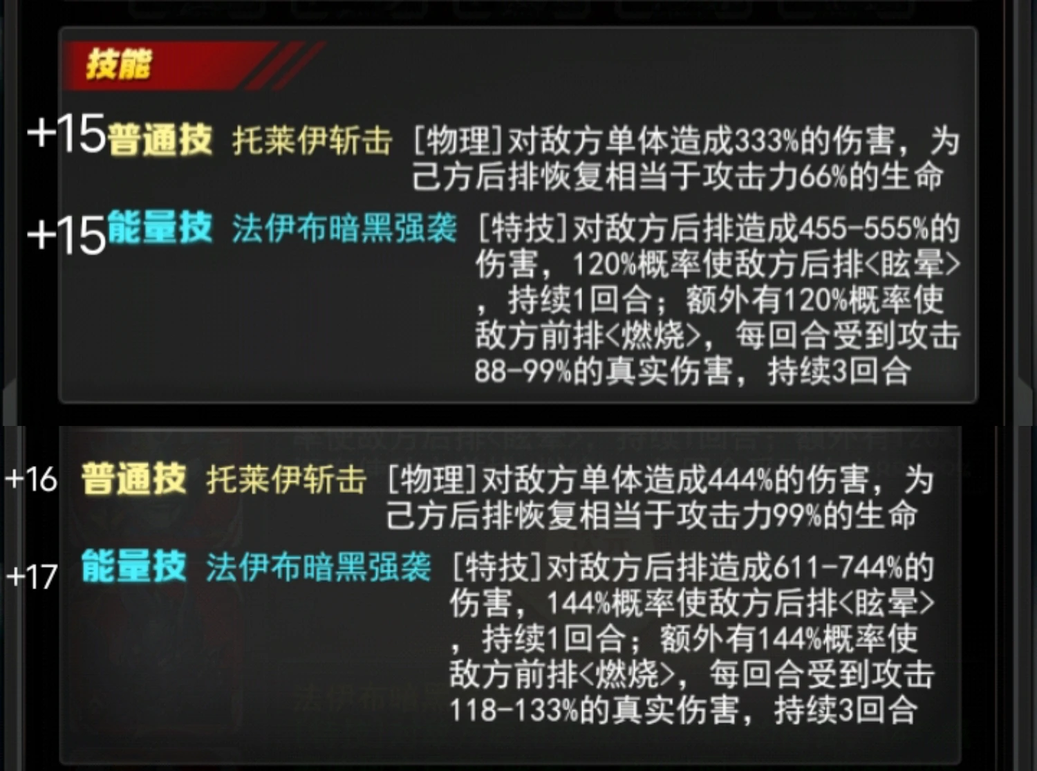 +16普通技 托莱伊斩击[物理]对敌方单体造成444%的伤害,为己方后排恢复相当于攻击力99%的生命