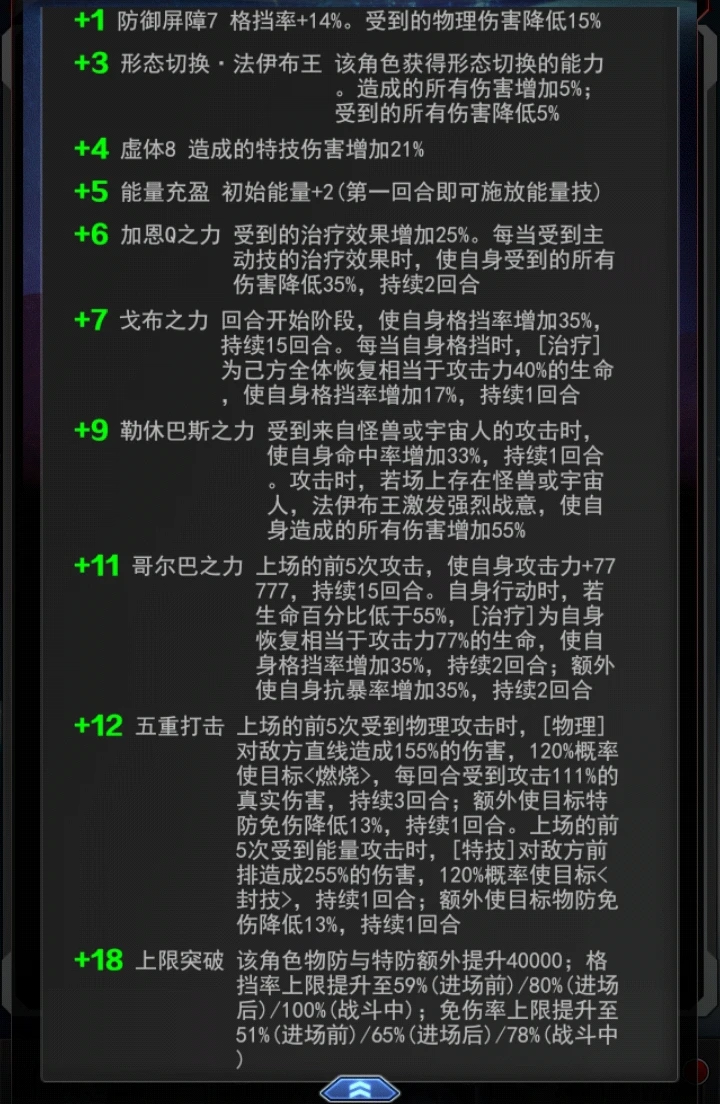 解析:前5次攻击时自身的攻击力将加77,000,最高也就是38万的攻击。这个界数值也不是很低,所以伤害也可以提大幅的提高一下,生命低于55%可以恢复生命值,这个也就是搞晕缸的作用了,只要能动得起来,回血就可以回家回起来增加抗爆率和格挡率,两回合35还是不错的。而且。他这个也没有标注可以触发几次,所以这个是可以无限触发的,只要能动得起来