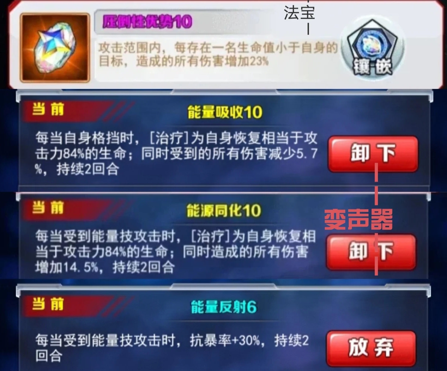 解析:受到的治疗效果增加25%,也就是普攻的回血能力可以增加到71%,然后被动回血可以增加到65%,这个提高也不错,可以提高自身的续航能力,受到主动性治疗,可以降低自身的伤害受到。也就是普攻的回血也就可以触发这个持续两回合是可以叠加,但是两次都使用普攻,应该也不怎么现实。所以还得需要角色的铺垫