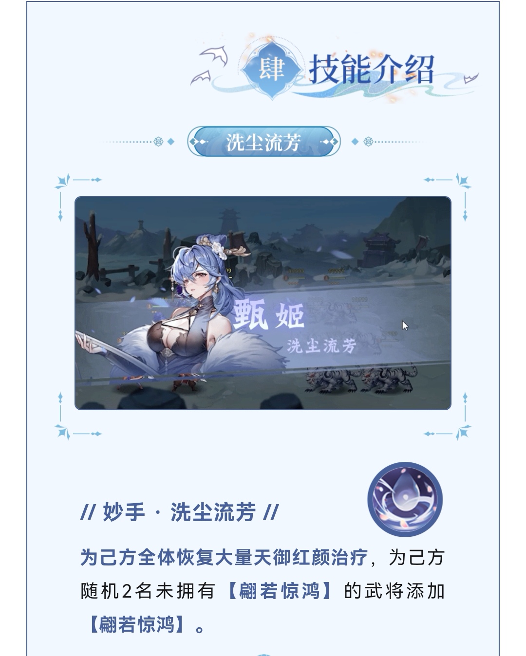 己方红颜释放技能时,给己方随机1人添加“洛灵”,优先选择具有“翩若惊鸿”的目标。