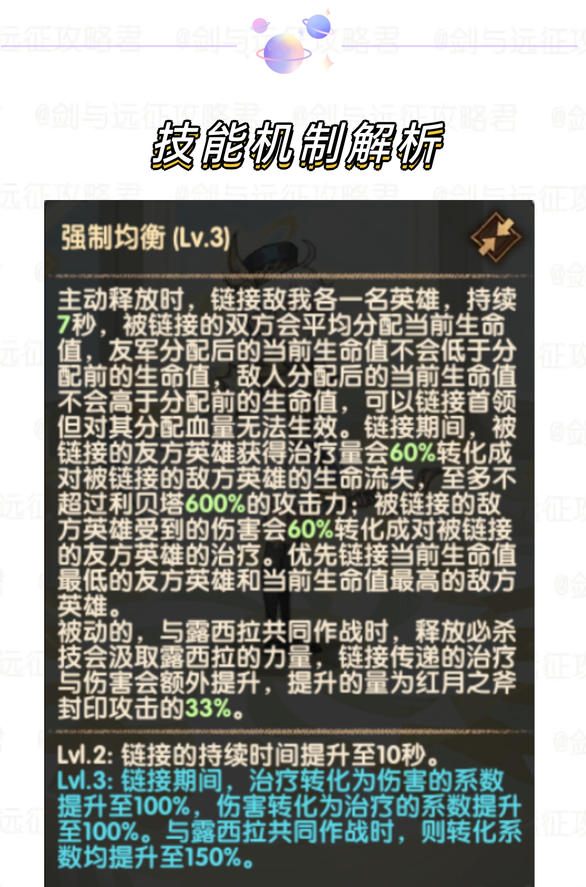 平分链接双方的当前生命值,且被链接的双方会有伤害与治疗互相转换的效果。